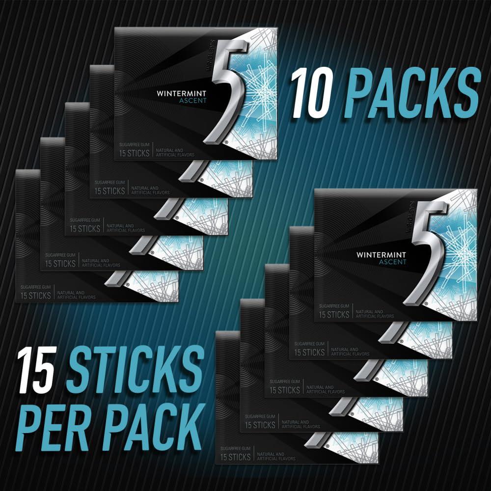 5 Gum Spearmint Rain Sugar Free Chewing Gum Bulk, 15 Stick Box (Pack of 10)(Wintermint Ascent)