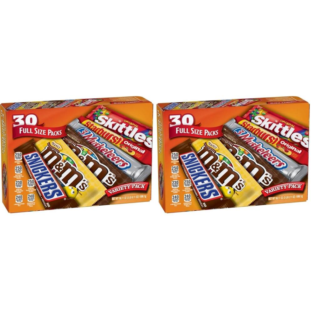 Mars M&M’S, SNICKERS, 3 MUSKETEERS, SKITTLES & STARBURST Variety Pack Full Size Bulk Candy Assortment, 56.11 oz, 30 Count(Full Size (Pack of 2))